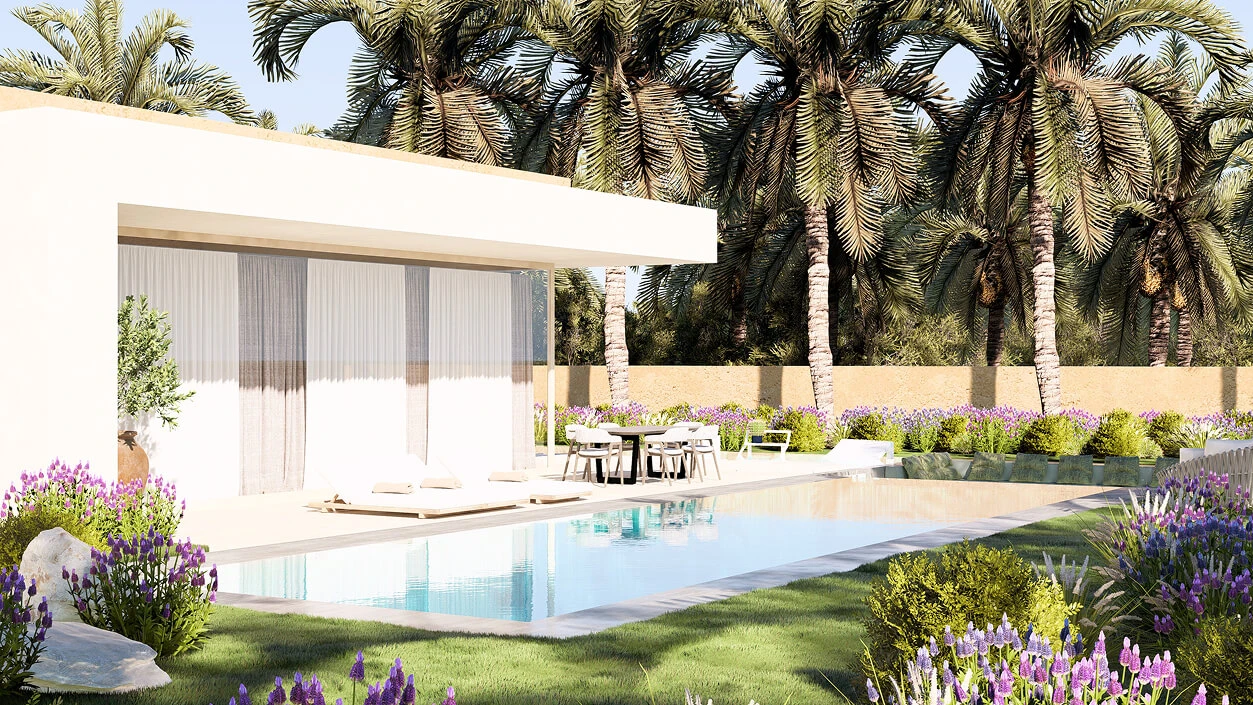Chaque villa Bell'View se déploie sur des terrains généreux de 1 200 à 1 800 m². Volumes baignés de lumière, jardins paysagers et piscine privée pensée comme le cœur de la maison.
